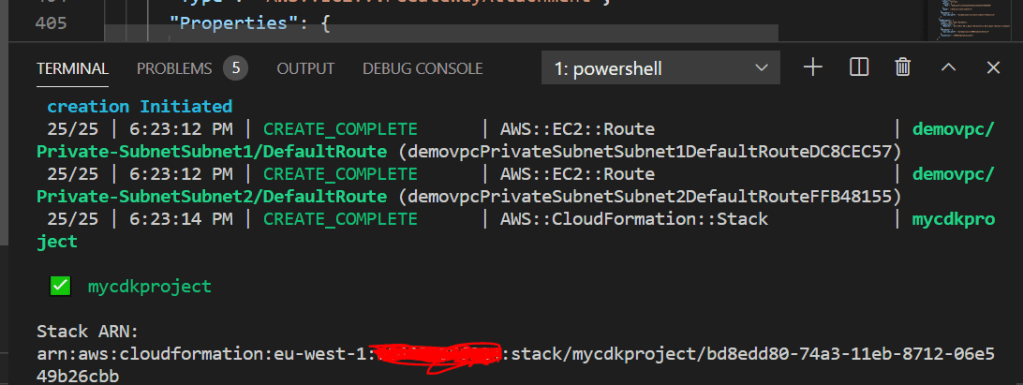 25/25 | 6:23:14 PM | CREATE_COMPLETE | AWS::CloudFormation::Stack | mycdkproject
